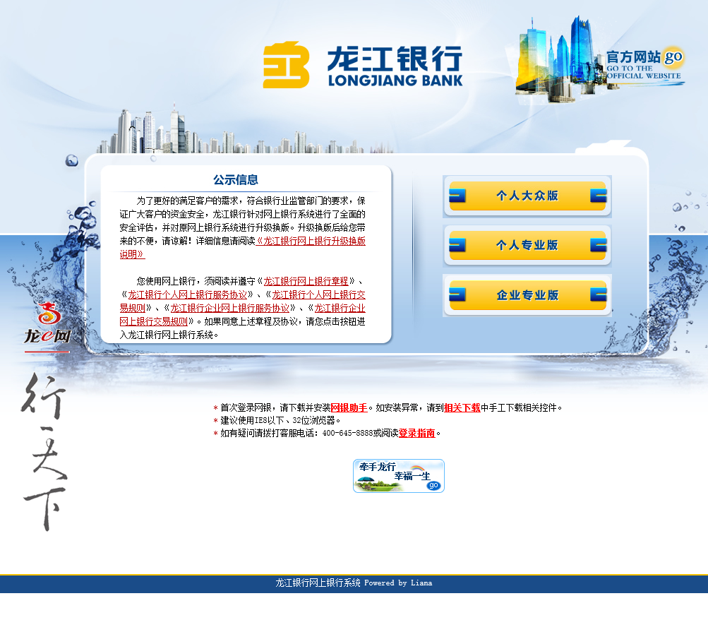 龙江银行网上银行于2020-07-18被0702投稿网收录,网站相关信息来自互联网或网友分享!由于(龙江银行网上银行)网站内容动态属性,时刻在变动,本站无法保证(龙江银行网上银行)网站内容真实可靠!请大家查阅时,谨慎选择、自辩真伪,感谢您的理解与支持。如果您在访问(龙江银行网上银行)时发现:网址失效、或网站存在非法等相关内容,请及时联系我们,我们会第一时间处理。