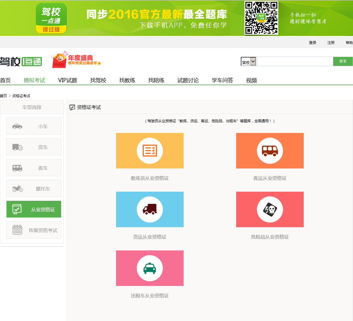 驾校一点通驾驶员从业资格证考试采用交通部2010年道路运输从业资格模证拟考试。包括客运驾驶员资格证模拟考试,货运驾驶员从业资格考试,危险品,出租车从业资格证题库。