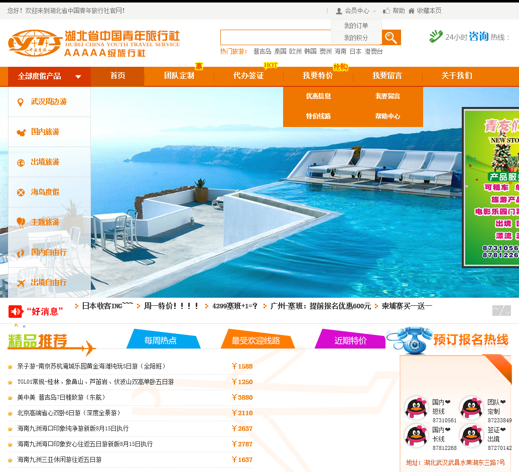 湖北省中国青年旅行社,团队定制87233849,出境签证87310561,国内短线87812268, 国内长线87270142。湖北中青旅、国际旅行社、中国旅行社、全国优秀旅行社、武汉旅行社、湖北省优秀旅行社、5A旅行社。