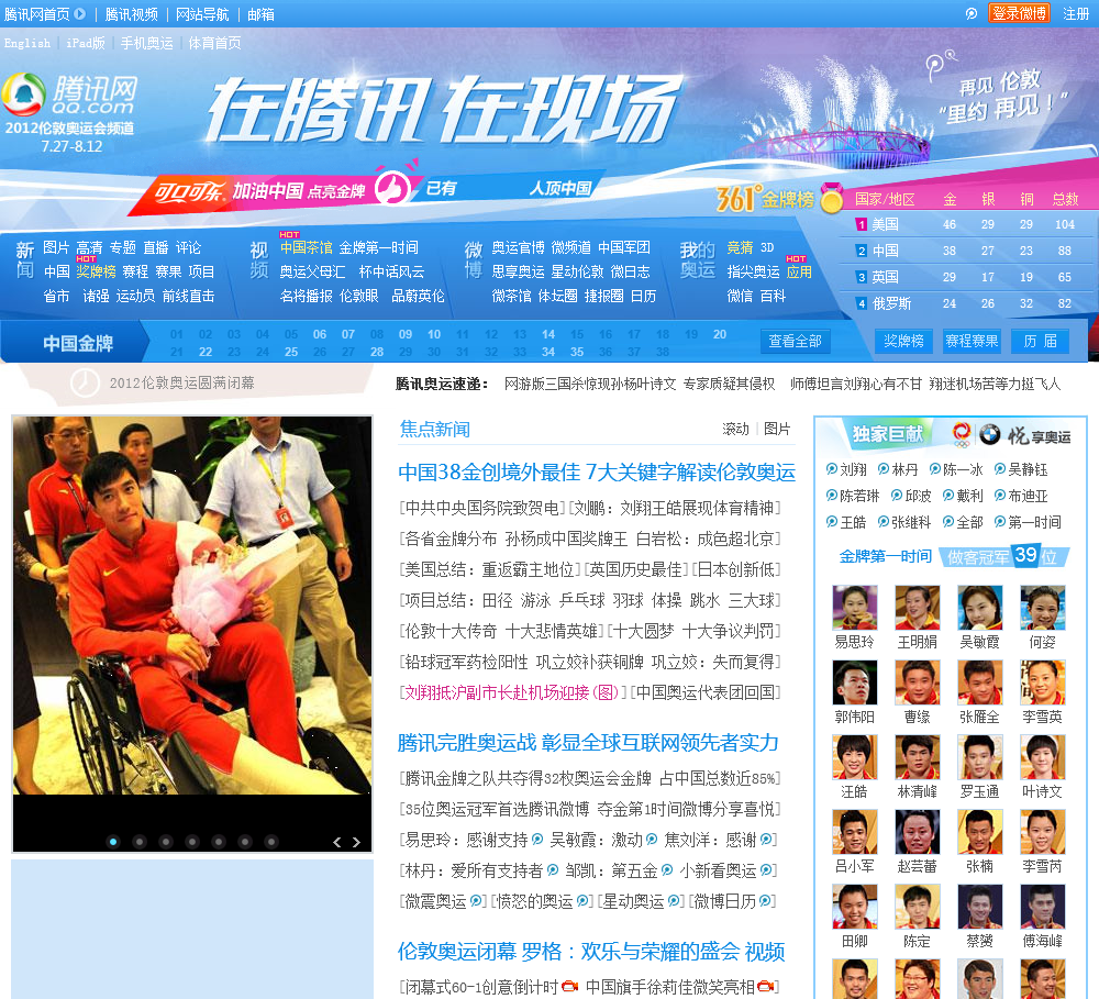腾讯网奥运站,快速的伦敦奥运新闻资讯,丰富奥运赛事报道,全面的奥运图片、视频和资料、精彩的奥运微博和互动社区