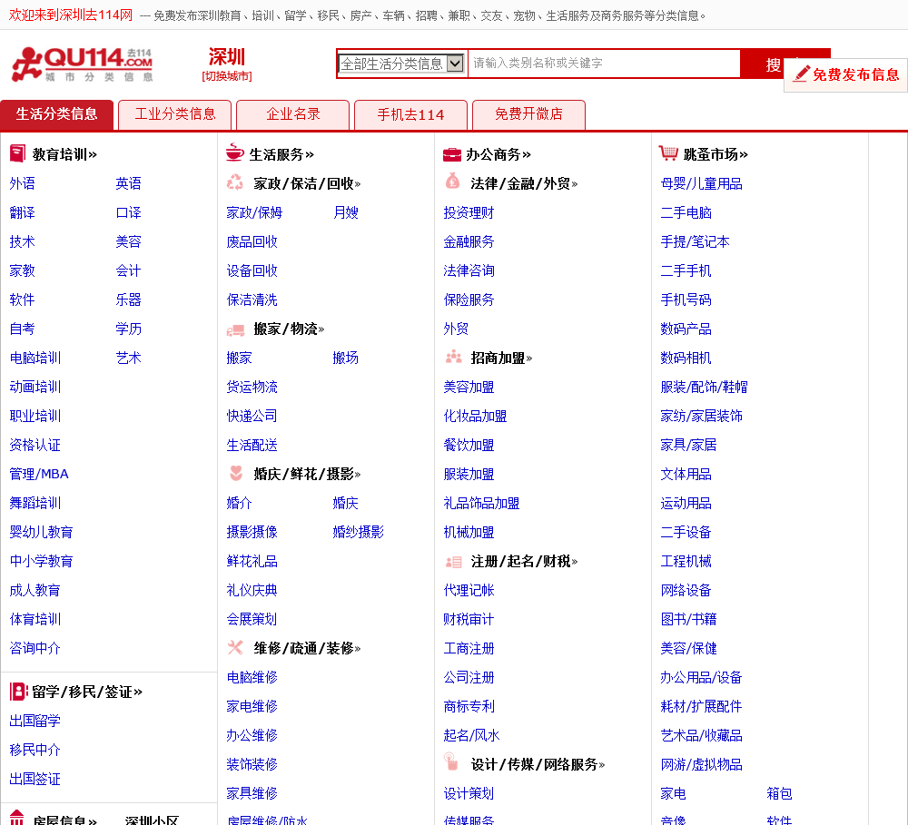 去114深圳分类信息网为您提供房产、教育、留学、车辆、招聘、兼职、黄页等海量深圳分类信息,满足您不同的深圳免费发布信息需求。深圳去114网,做好的深圳免费发布信息网。