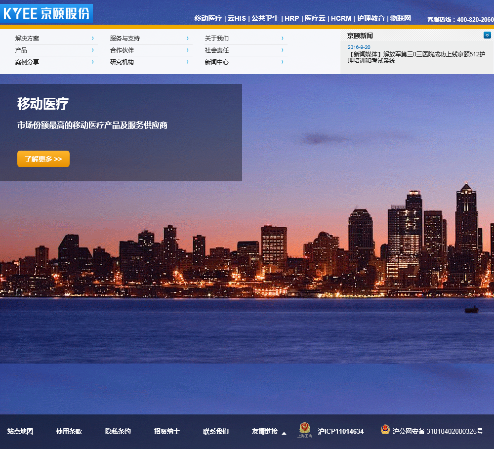 上海京颐科技(KingYee)成立于2004年,前身睿林科技,是一家智慧医疗技术及服务提供商,主要业务有:移动医疗、医疗物联网、医院HRP、去医院(掌上医院)4大部分。