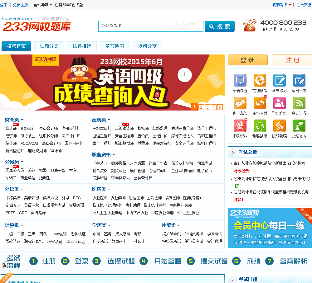 233网校在线考试系统,试题库拥有丰富的试题;是一个全国各种学历考试,资格认证考试的全真在线模拟考试网站,提供自动阅卷评分以及试题解析等多功能服务,是各类考生考前辅导学习的练兵必备工具