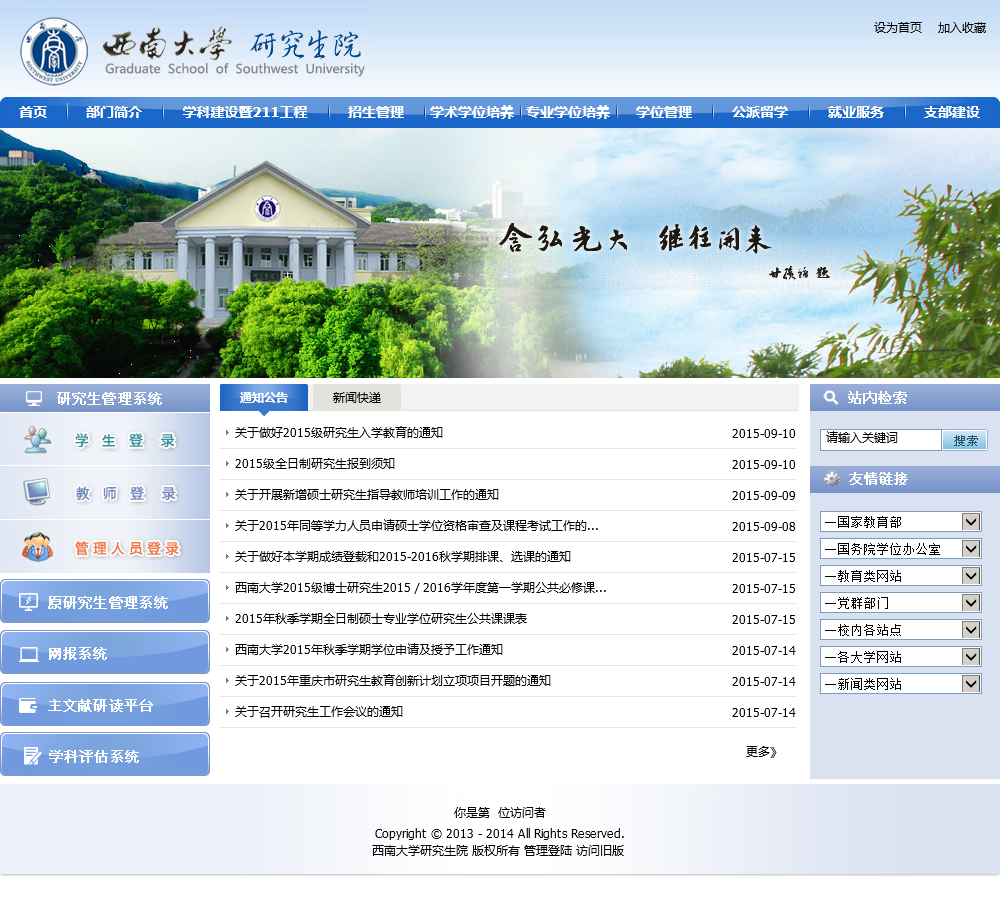 西南大学研究生院于2020-07-24被0702投稿网收录,网站相关信息来自互联网或网友分享!由于(西南大学研究生院)网站内容动态属性,时刻在变动,本站无法保证(西南大学研究生院)网站内容真实可靠!请大家查阅时,谨慎选择、自辩真伪,感谢您的理解与支持。如果您在访问(西南大学研究生院)时发现:网址失效、或网站存在非法等相关内容,请及时联系我们,我们会第一时间处理。