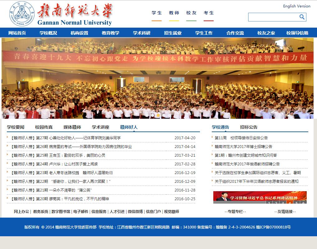 赣南师范大学于2020-07-25被0702投稿网收录,网站相关信息来自互联网或网友分享!由于(赣南师范大学)网站内容动态属性,时刻在变动,本站无法保证(赣南师范大学)网站内容真实可靠!请大家查阅时,谨慎选择、自辩真伪,感谢您的理解与支持。如果您在访问(赣南师范大学)时发现:网址失效、或网站存在非法等相关内容,请及时联系我们,我们会第一时间处理。