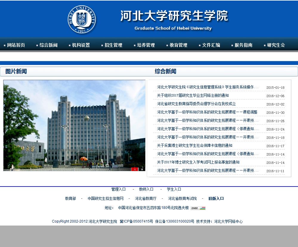 河北大学研究生院于2020-07-28被0702投稿网收录,网站相关信息来自互联网或网友分享!由于(河北大学研究生院)网站内容动态属性,时刻在变动,本站无法保证(河北大学研究生院)网站内容真实可靠!请大家查阅时,谨慎选择、自辩真伪,感谢您的理解与支持。如果您在访问(河北大学研究生院)时发现:网址失效、或网站存在非法等相关内容,请及时联系我们,我们会第一时间处理。
