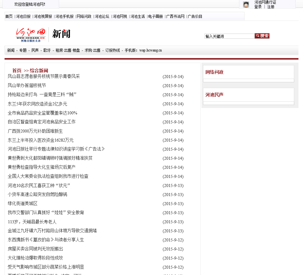 河池网新闻频道于2020-07-28被0702投稿网收录,网站相关信息来自互联网或网友分享!由于(河池网新闻频道)网站内容动态属性,时刻在变动,本站无法保证(河池网新闻频道)网站内容真实可靠!请大家查阅时,谨慎选择、自辩真伪,感谢您的理解与支持。如果您在访问(河池网新闻频道)时发现:网址失效、或网站存在非法等相关内容,请及时联系我们,我们会第一时间处理。