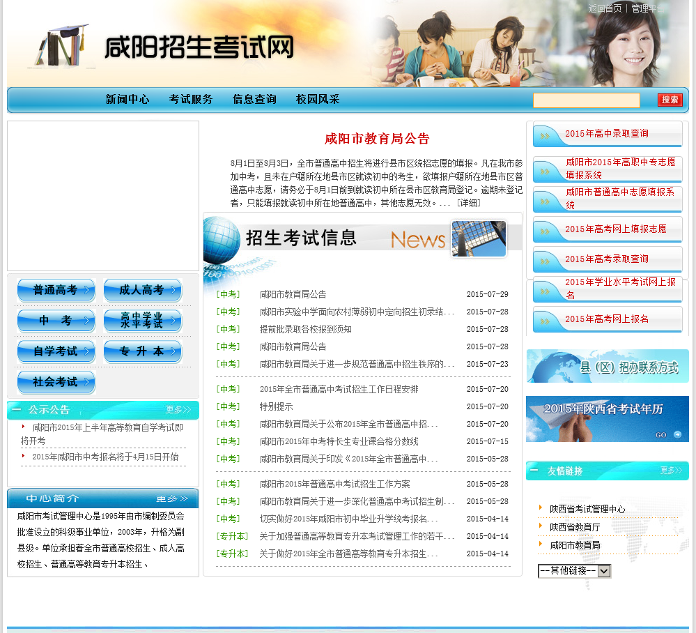咸阳招生考试信息网于2020-08-01被0702投稿网收录,网站相关信息来自互联网或网友分享!由于(咸阳招生考试信息网)网站内容动态属性,时刻在变动,本站无法保证(咸阳招生考试信息网)网站内容真实可靠!请大家查阅时,谨慎选择、自辩真伪,感谢您的理解与支持。如果您在访问(咸阳招生考试信息网)时发现:网址失效、或网站存在非法等相关内容,请及时联系我们,我们会第一时间处理。