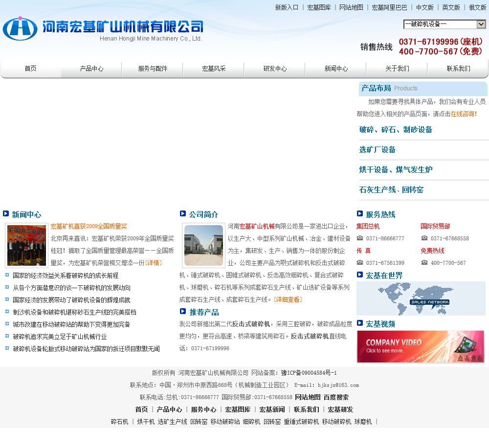 河南宏基矿山机械有限公司,为中国郑州的矿山机械生产企业,主要产品为:破碎机、颚式破碎机、反击式破碎机、制砂机、球磨机、选矿设备、烘干机、石灰设备、轧钢设备、破碎设备等,集研发、生产、销售为一体的大型企业。大型企业的售后保证,欢迎广大用户到厂考察访问,电话:0371-67199996