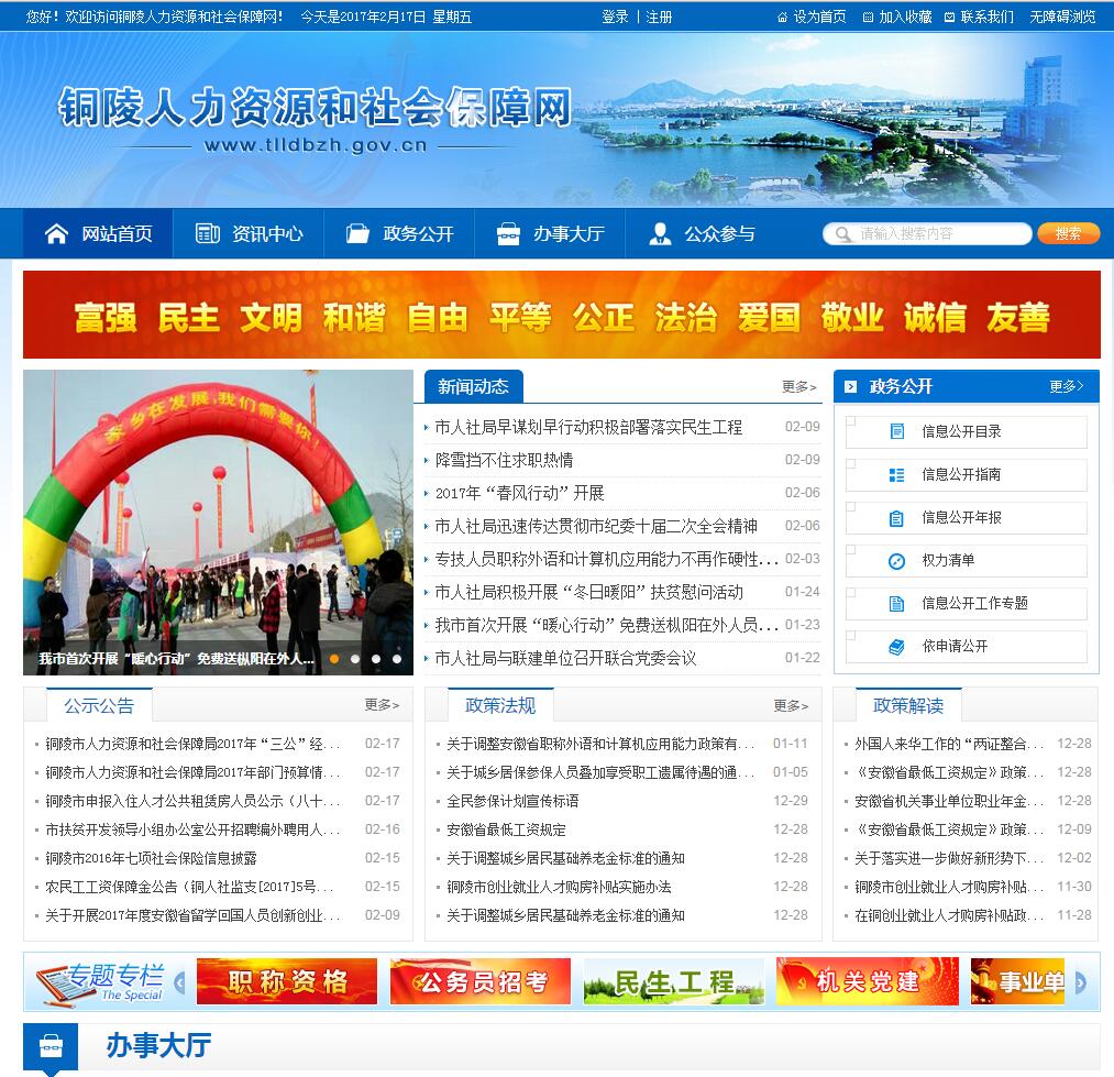铜陵人力资源和社会保障网是铜陵市人力资源和社会保障局在互联网上建立的综合性政府门户网站,公众可通过网站了解有关人力资源和社会保障业务的办事程序、咨询相关的政策法规、举报违反人力资源和社会保障法律法规的行为、监督人力资源和社会保障各部门、单位的工作。同时,也可以通过网站查询有关职业介绍、技能...