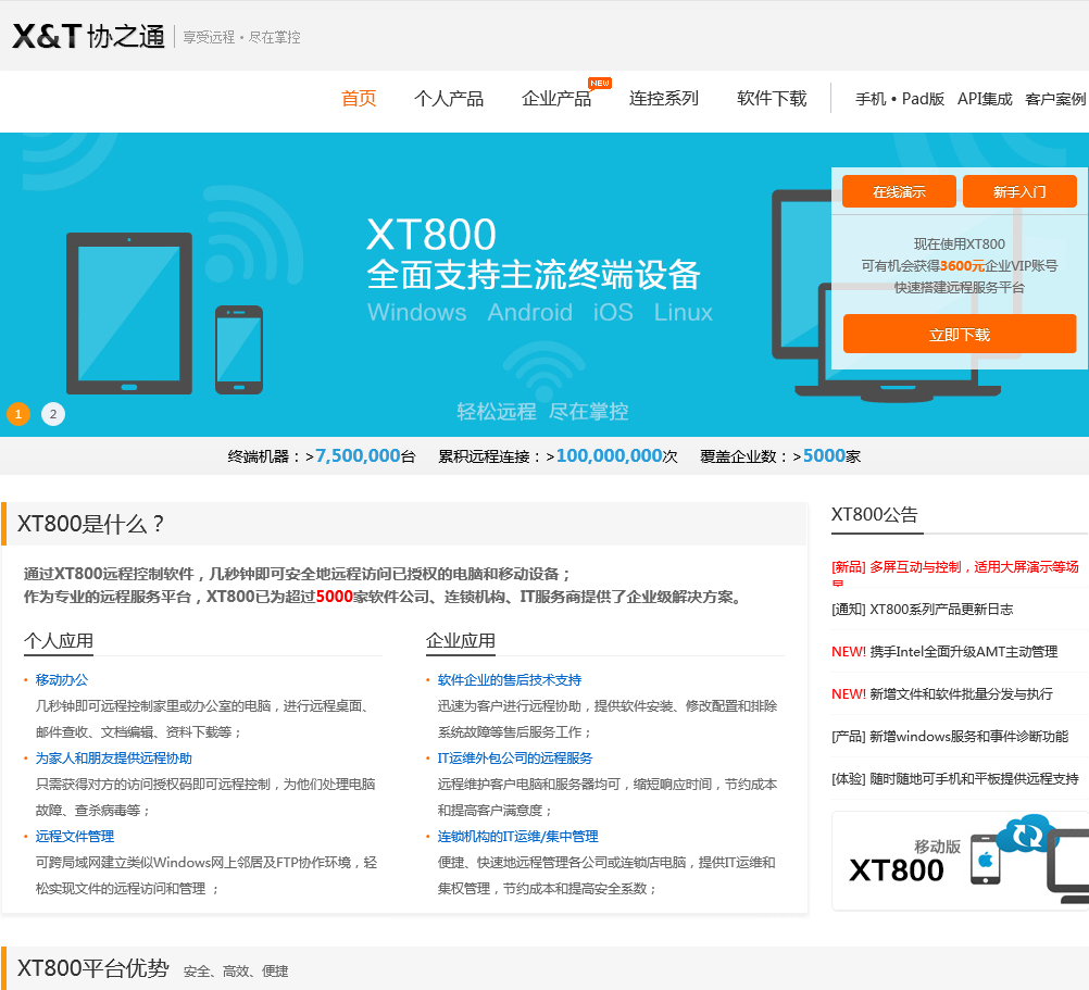 通过协通XT800远程控制软件只需几秒钟时间,即可安全地远程控制已授权的电脑或服务器、进行远程协助、远程文件管理和即时通讯,协通XT800远程协助软件已为超过5000家企业提供了专业的远程IT运维管理方案。