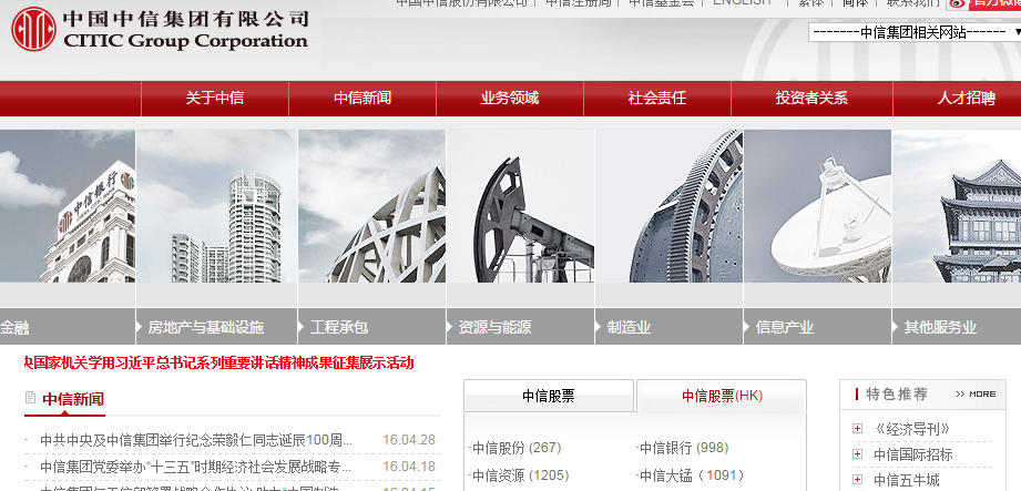 中国中信集团有限公司于2020-08-07被0702投稿网收录,网站相关信息来自互联网或网友分享!由于(中国中信集团有限公司)网站内容动态属性,时刻在变动,本站无法保证(中国中信集团有限公司)网站内容真实可靠!请大家查阅时,谨慎选择、自辩真伪,感谢您的理解与支持。如果您在访问(中国中信集团有限公司)时发现:网址失效、或网站存在非法等相关内容,请及时联系我们,我们会第一时间处理。