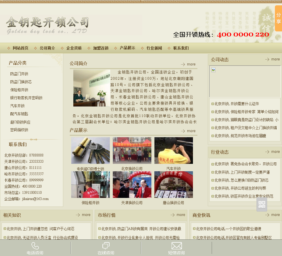 北京金钥匙开锁服务有限公司,北京金钥匙开锁公司是全国连锁企业,创建于2002年,注册资金100万元,注册地址北京建国路18号。公司主要承接开修换锁、银行取款机解码、汽车钥匙匹配等中高端锁具服务。公司是北京首批110联动开锁单位,北京开锁协会第三届副会长单位.